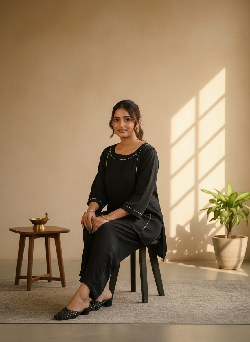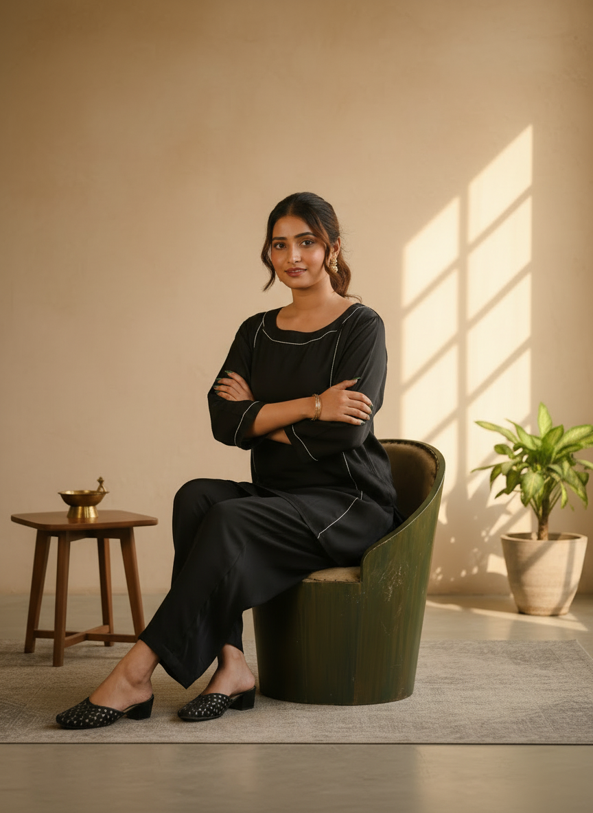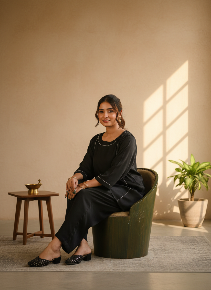 A sleek and modern co-ord set in luxurious black Pure Bemberg Modal designed for effortless elegance. The top features a relaxed, boxy silhouette with subtle contrast stitch accents, while the pants are finished with charming ankle dori (tie-up) detailing for a playful twist. Lightweight and breathable with a graceful drape, this set is perfect for intimate gatherings, festive lounging, or elevated everyday wear.