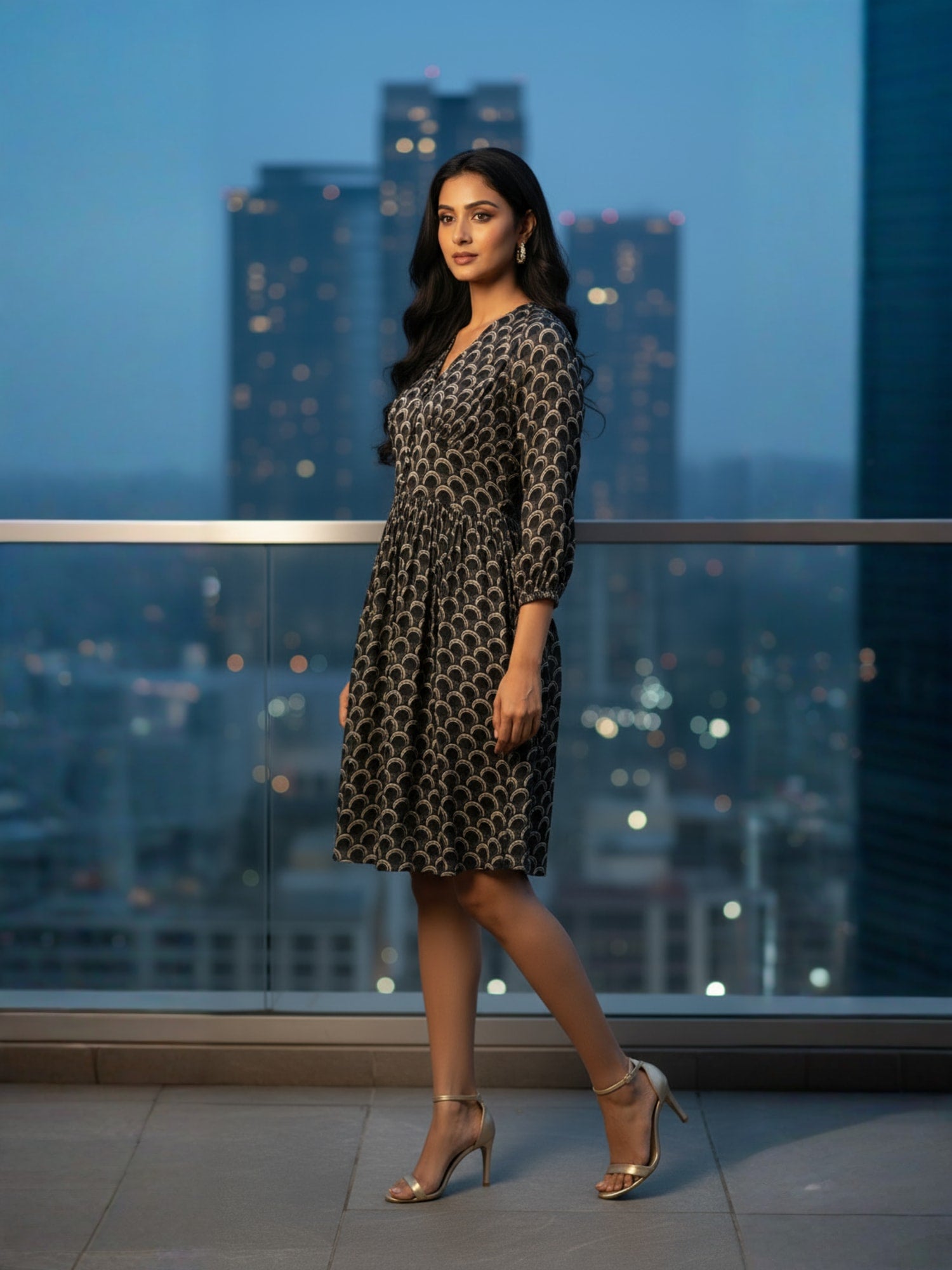 This black short dress features a relaxed yet flattering silhouette with soft pleats, creating beautiful movement. Crafted in breathable fabric with a subtle all-over motif print, it comes with full sleeves gathered at the cuffs and a round neckline with slight gathers for added charm. The perfect mix of comfort and effortless style.
