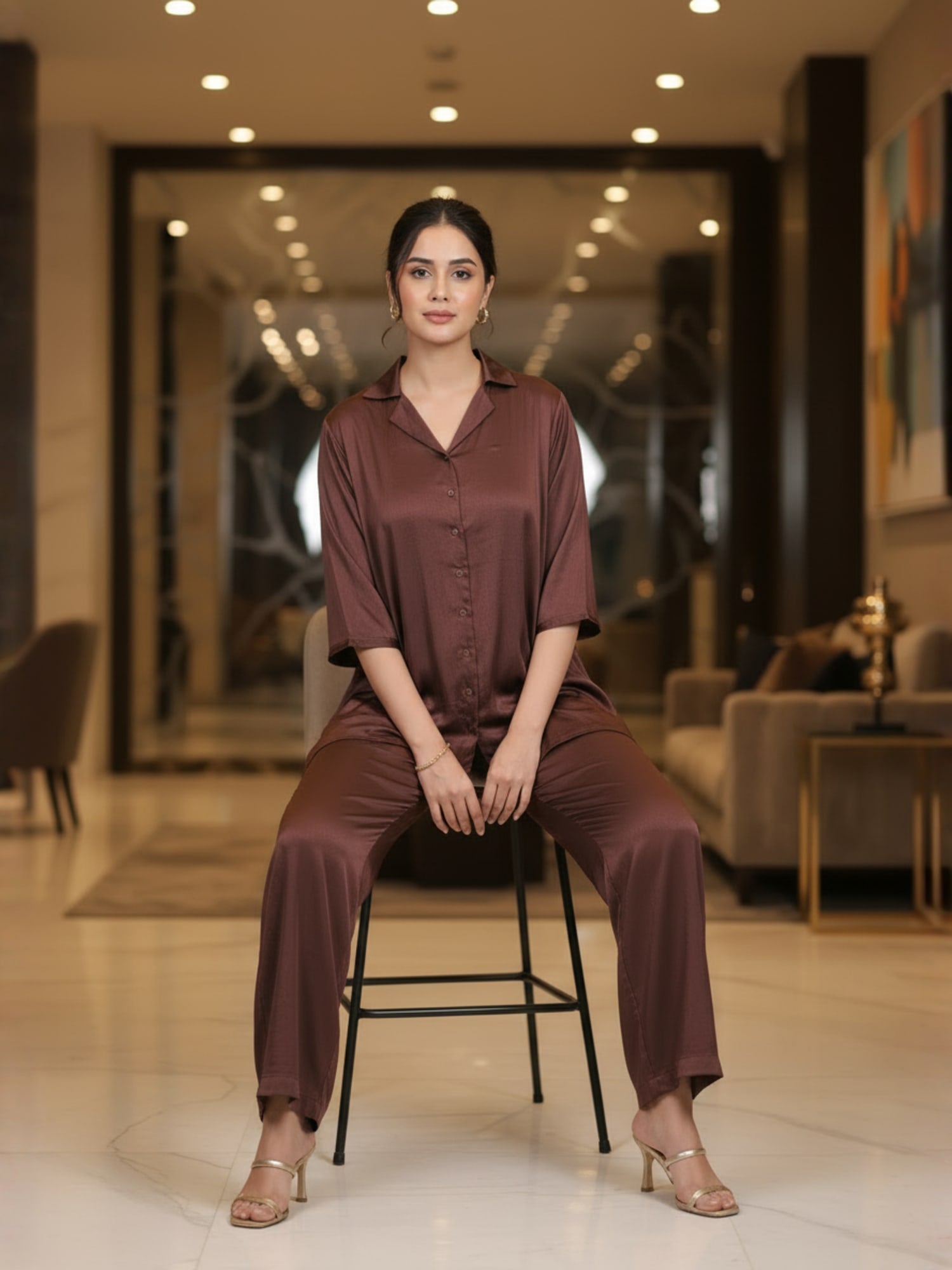 Step into luxe comfort with this chocolate brown satin co-ord set, featuring a relaxed-fit collared shirt paired with matching wide-leg trousers. The set exudes a soft sheen and effortless elegance, perfect for elevated casual wear or stylish travel looks.