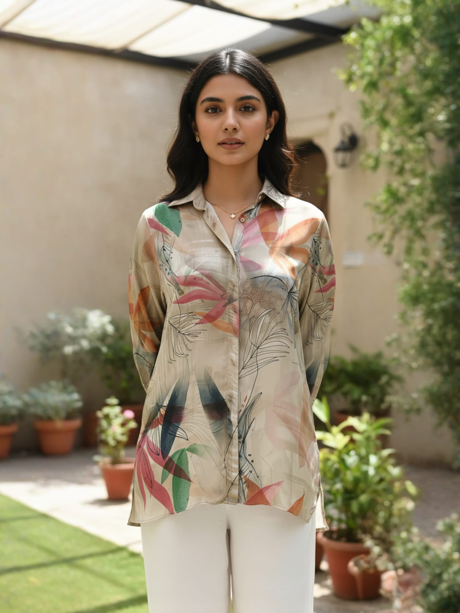 A contemporary high-low shirt in ivory with abstract floral prints, designed to offer effortless elegance and comfort. Ideal for casual outings or brunches, this versatile piece adds a touch of flair to your wardrobe.