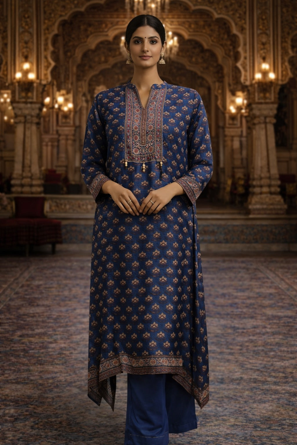 Featuring a block-print floral motif, this kurta is styled with a detailed mandarin collar and V-neckline. A heavily embroidered front placket enhances the design, bringing together heritage detailing with contemporary elegance.