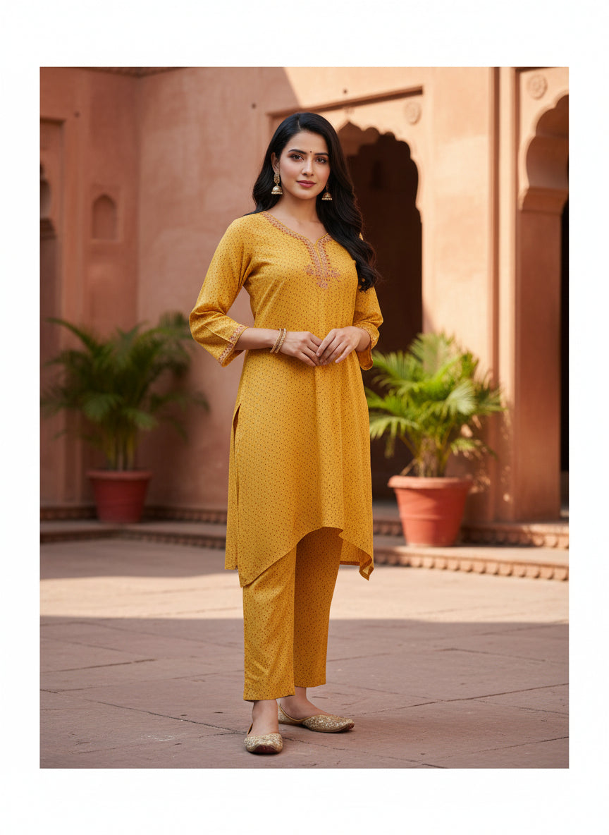 Radiating festive warmth and elegance, this Mustard Yellow Kurta Set is crafted from luxurious chinon chiffon with a comfortable santone lining for a smooth finish and graceful fall. The kurta features delicate all-over prints, highlighted with intricate embroidery along the neckline and subtle detailing on the sleeves. The flared sleeves add a contemporary twist to the traditional silhouette, while the straight-fit pants complete the look with understated charm. Perfect for festive celebrations or daytime gatherings, this set beautifully blends comfort with festive sophistication.