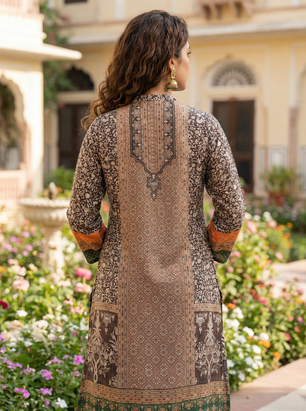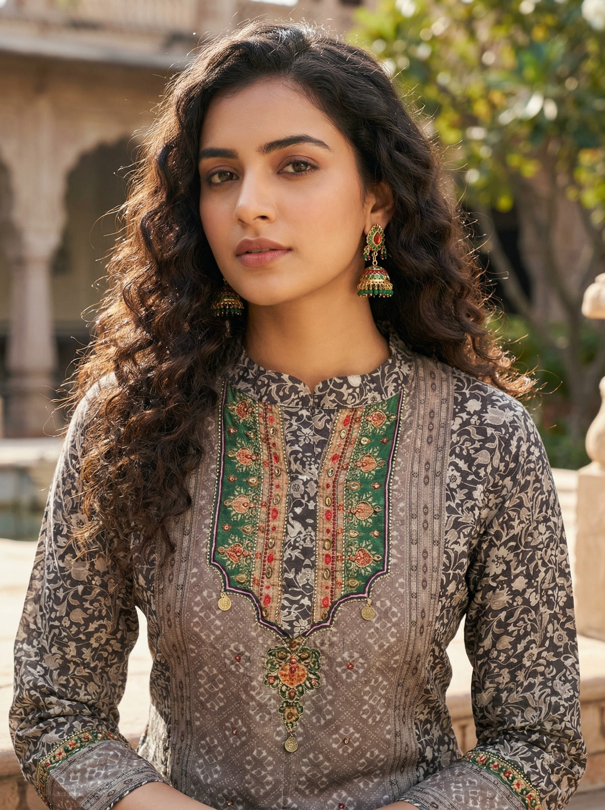 Print & Pattern: The garment features a paneled print design. The center panel has a delicate, geometric micro-print, while the side panels showcase larger, traditional floral and vine motifs reminiscent of Kalamkari or Ajrakh styles.