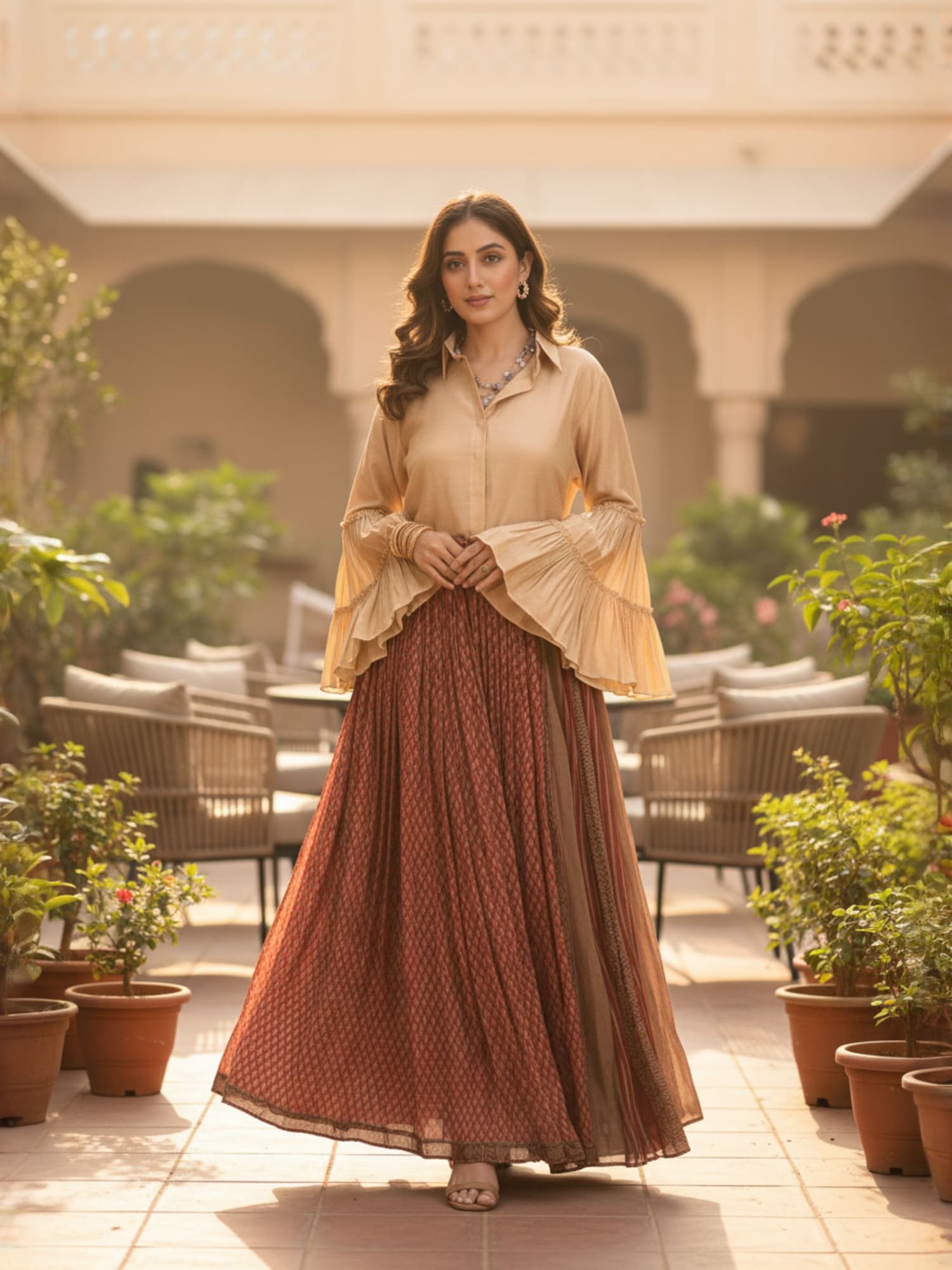 Bring tradition and elegance together with this gorgeous rust and brown flared skirt featuring a timeless bandhani-inspired print. Crafted in soft, flowy fabric with an airy silhouette, this skirt is perfect for festive gatherings or casual ethnic styling. Style it with a crop top, shirt, or kurti for a complete look.