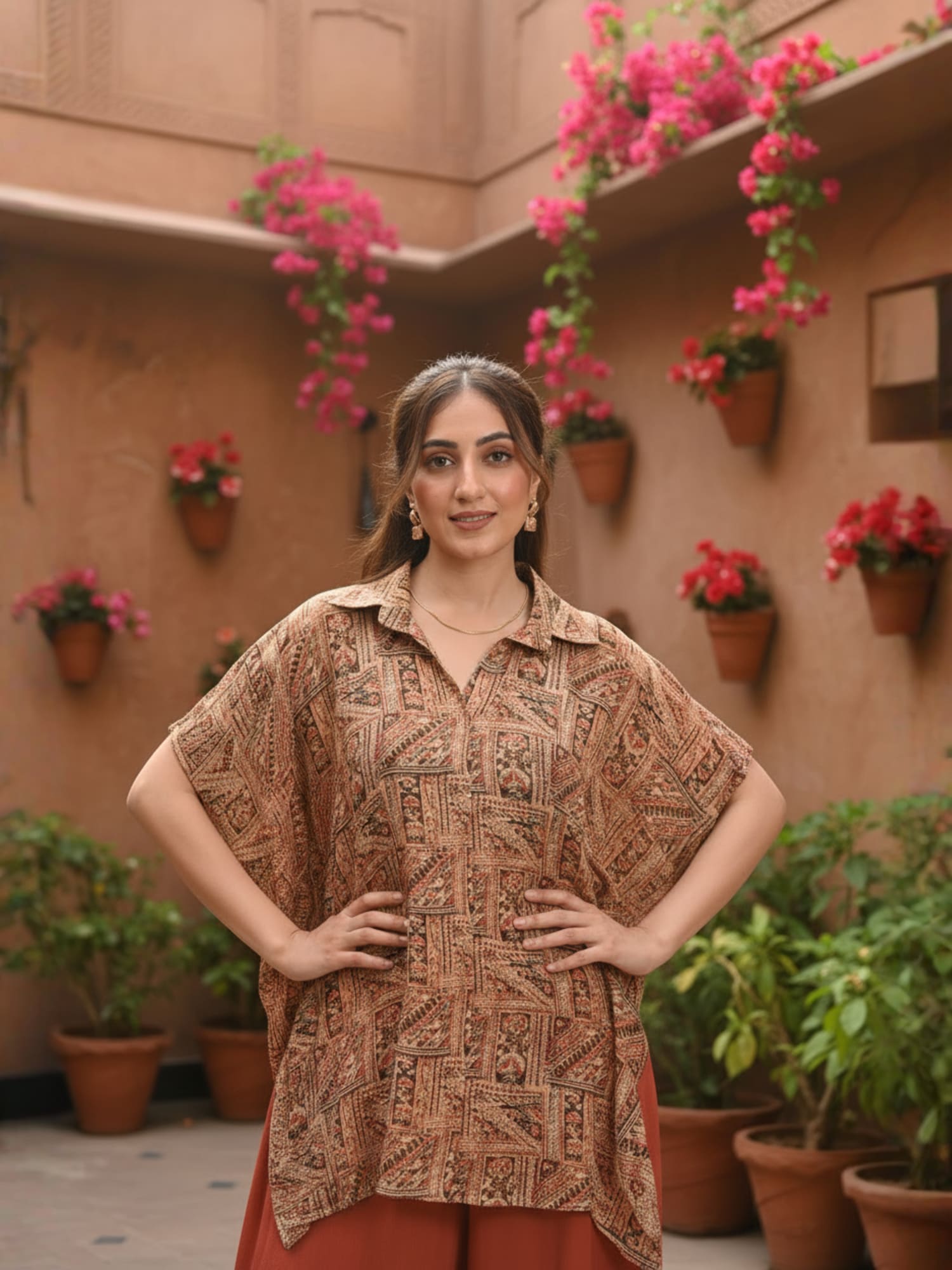 Make a statement with this contemporary Indo-western ensemble featuring a high-low printed shirt. The beige shirt showcases a subtle multicolor ethnic print, elbow-length sleeves, and a classic collared neckline with front buttons, blending comfort with style. Perfect for festive gatherings, cultural events, or chic casual outings.