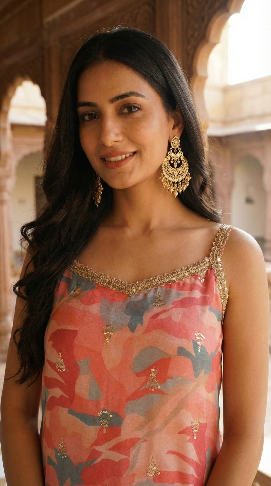 This graceful two-piece ensemble is a sleeveless, straight-cut tunic paired with flowing flared pants, both adorned with an abstract floral print in soft coral, blush, and muted teal tones. The delicate gold lace detailing along the neckline and straps adds a refined, festive touch. The silhouette is airy and feminine, creating an elegant look that is perfect for daytime celebrations, festive gatherings, or summer occasions.