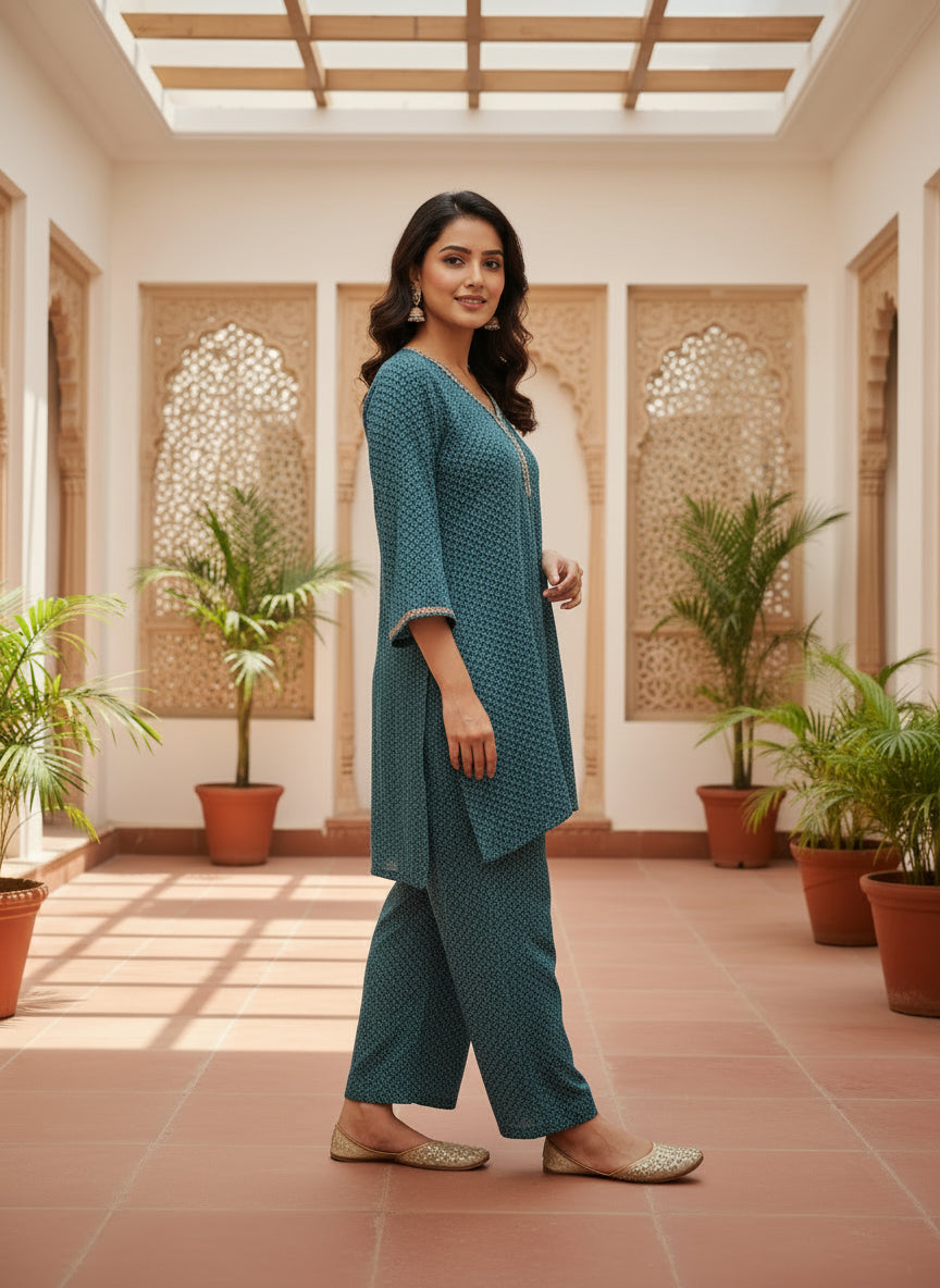 Elegant and festive, this Teal Blue Kurta Set is crafted from luxurious chinon chiffon, known for its soft sheen and graceful flow. The kurta features an all-over geometric print enhanced with delicate mirror embroidery work along the neckline and sleeve edges, adding a subtle sparkle to its classic silhouette. Designed with flared sleeves and an asymmetrical hemline, the outfit offers a perfect balance of comfort and style. Paired with wide-leg pants in a matching print, this ensemble is ideal for festive gatherings and traditional celebrations.