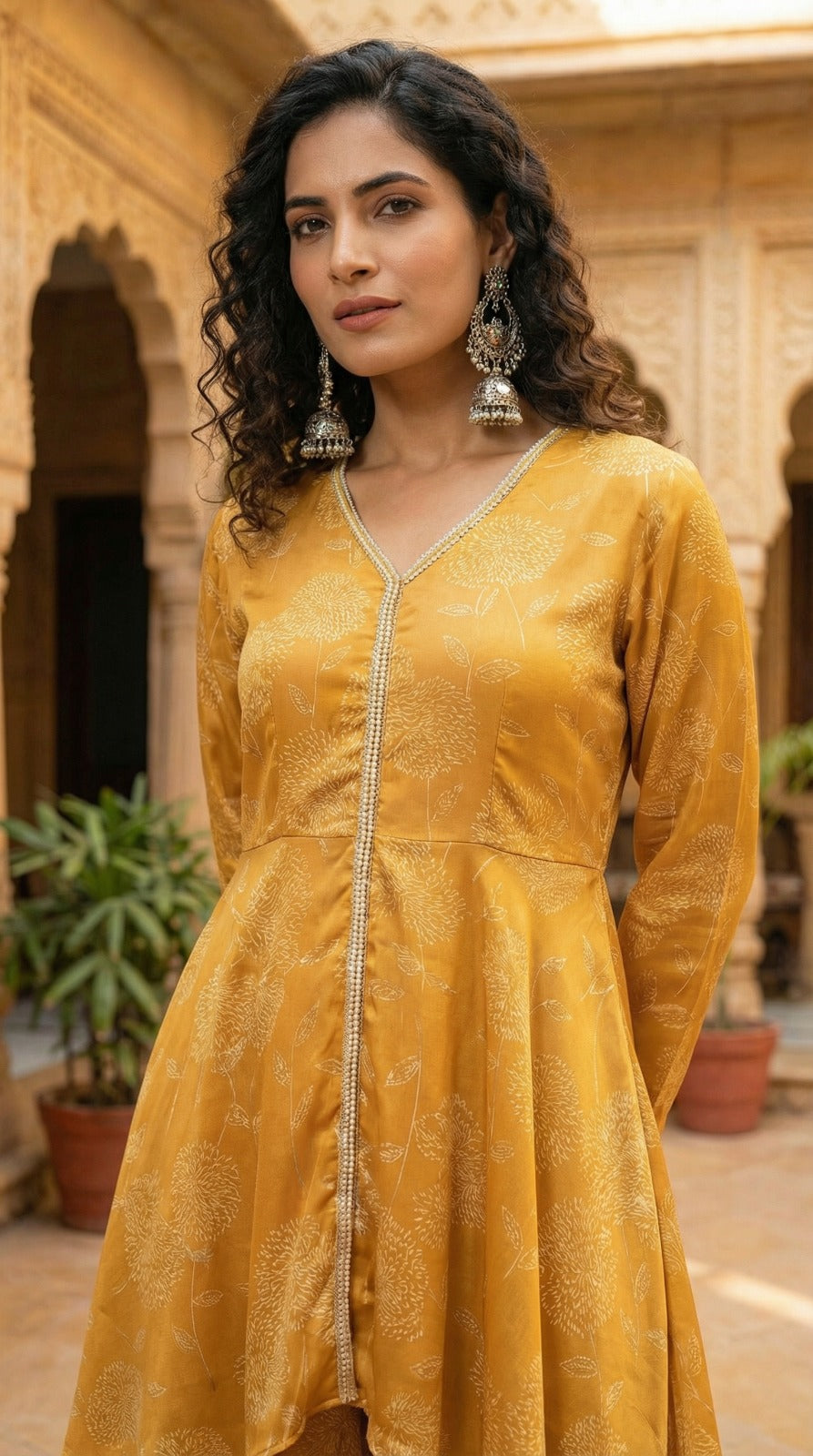 Exude effortless charm in this mustard gold three-piece set, combining contemporary design with ethnic grace. The kurta features an asymmetrical layered hem and elegant gota lace detailing along a flattering V-neckline. Paired with wide-flared palazzo pants in matching fabric and a plain solid chiffon dupatta, this ensemble is both striking and comfortable. Perfect for festive occasions, intimate weddings, or celebratory gatherings, this outfit offers a refined silhouette and flowy movement that flatters every body type.
